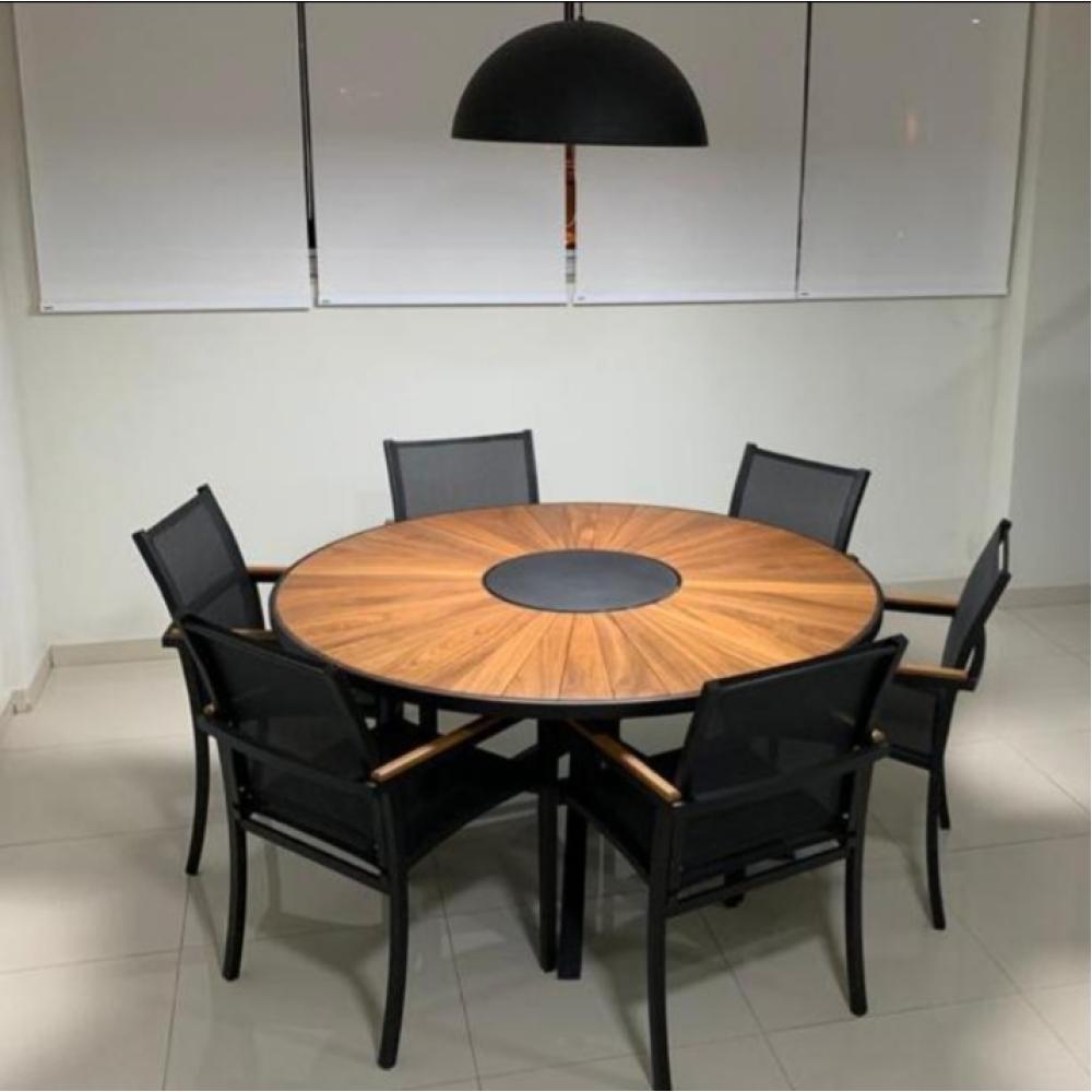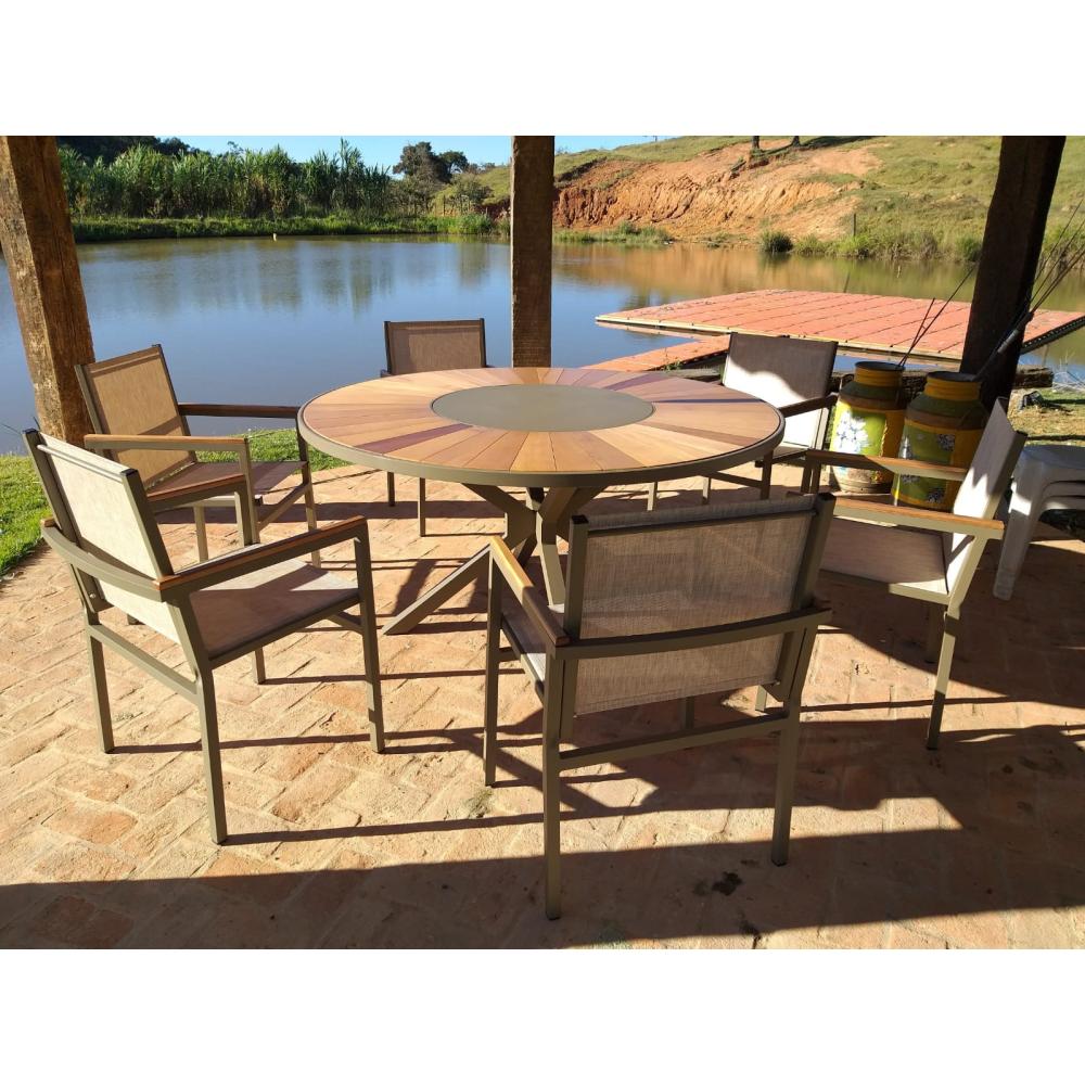 Conjunto composto por 06 poltronas e 01 mesa 1,50m tampo madeira com giratório central