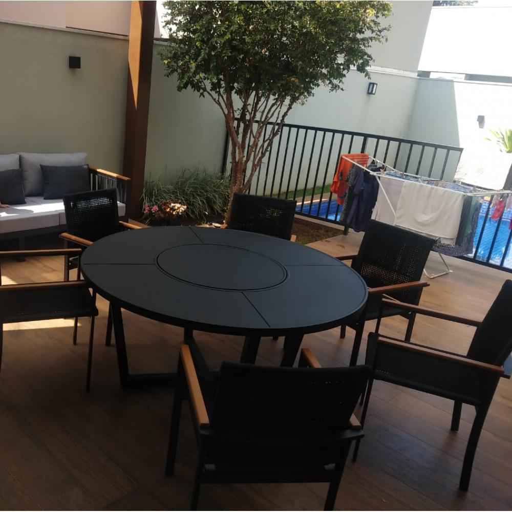 Conjunto composto por 6 poltronas e 1 mesa 1,50m tampo alumínio com giratório central .