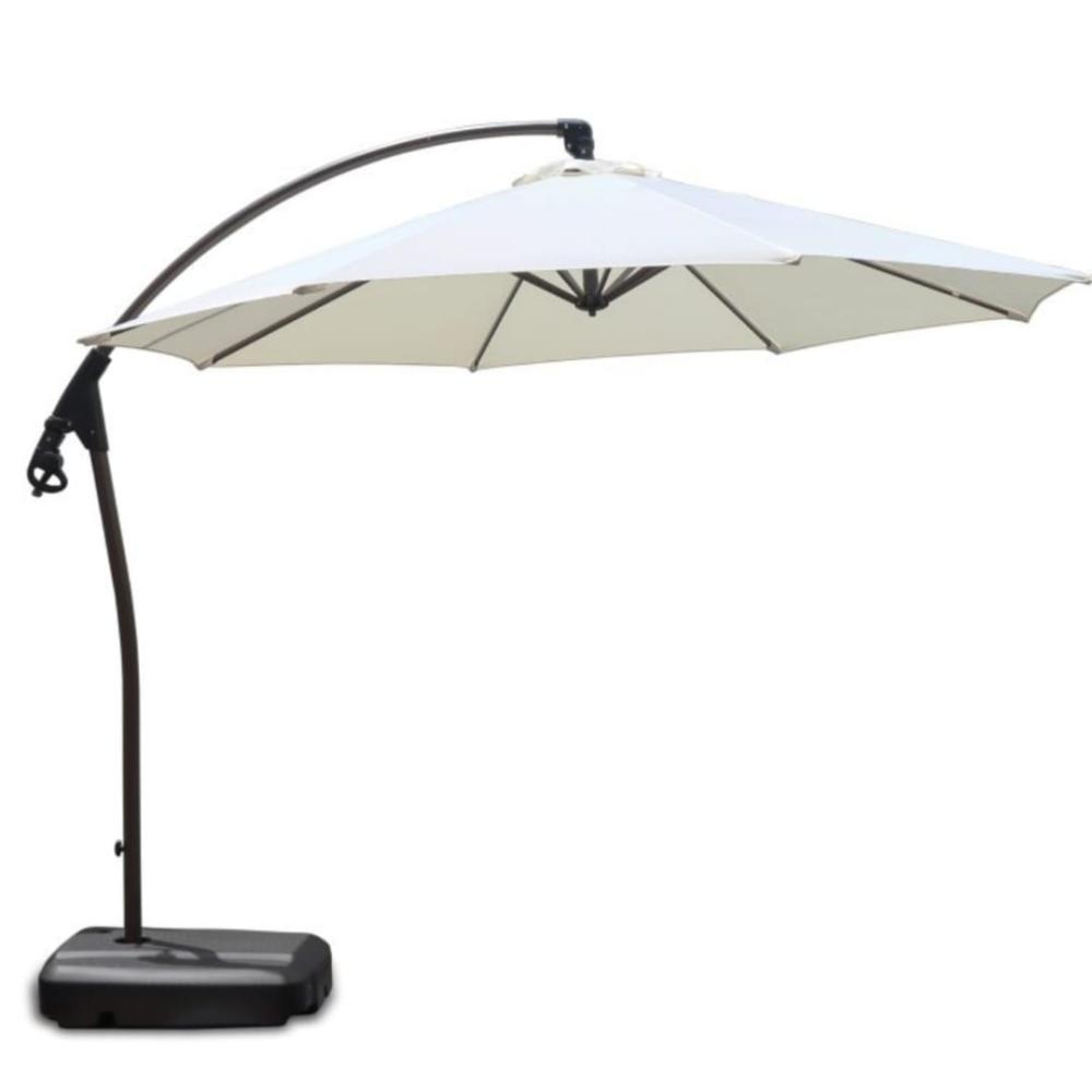 Ombrelone pendente de mastro lateral com cobertura redonda de ø3m. Possui comando de abertura e fechamento acionados por uma manivela de fácil e rápido manuseio. Design diferenciado para utilização em residências por sua facilidade de montagem e manuseio. Possui giro 360º em estágios de 90º e inclinação frontal da cobertura.
