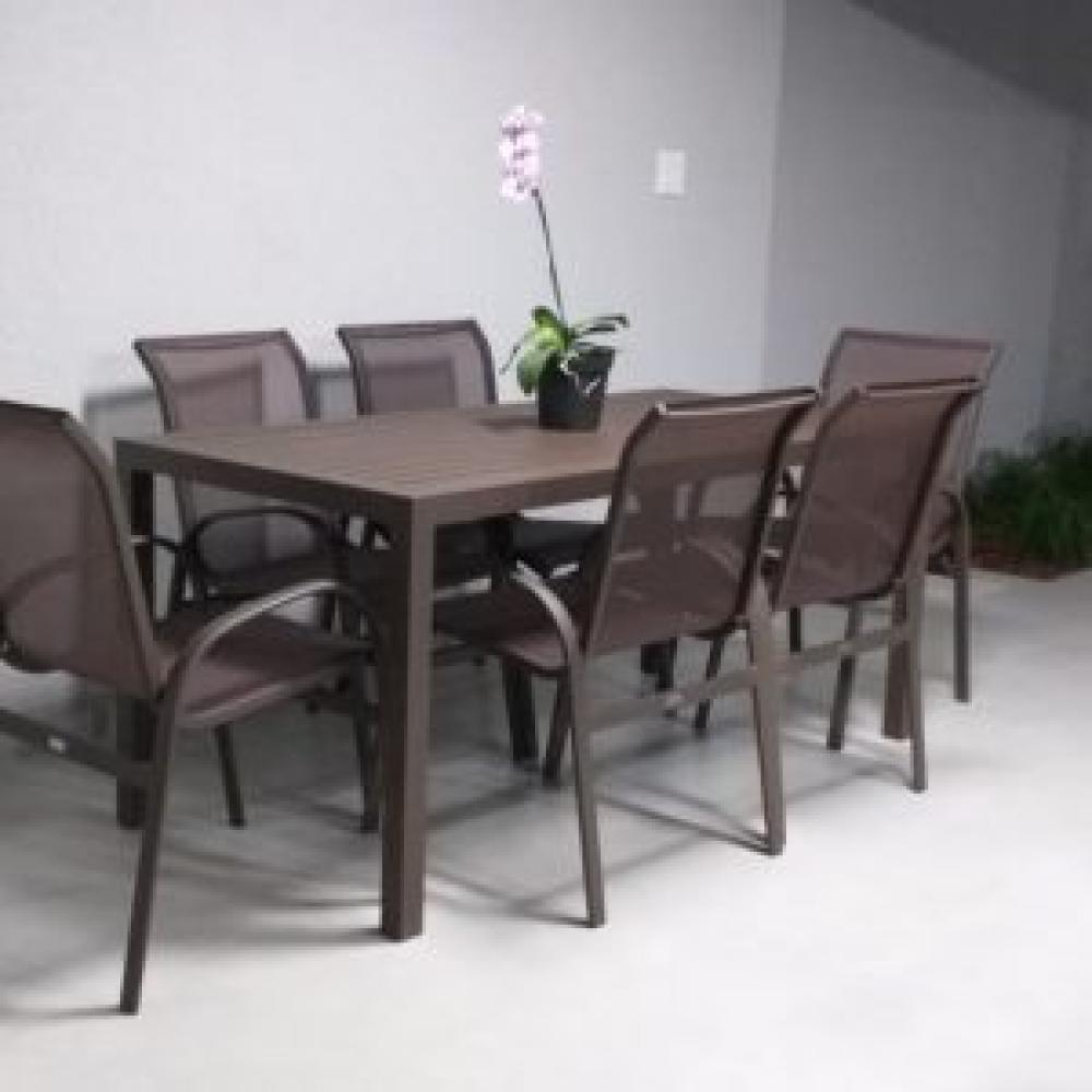 Conjunto composto por 06 poltronas e 01 Mesa retangular 1,50x90cm tampo alumínio